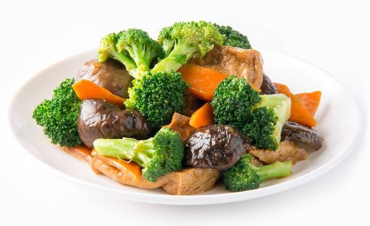 Shiitake mushrooms tossed with bean curd, broccoli and carrots