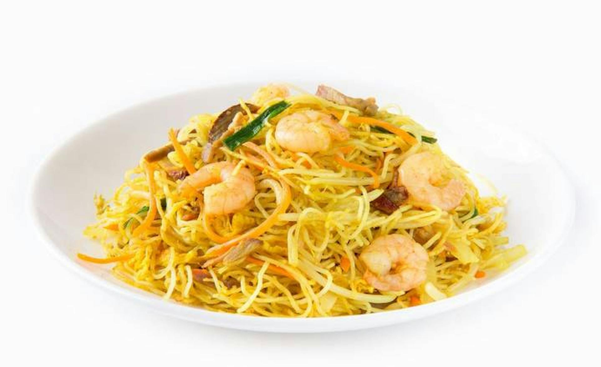 Thin vermicelli noodles tossed with curry, BBQ pork, shrimp